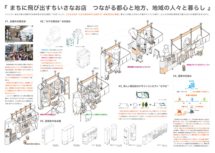 シャッター街となった商店街のシャッターの前で展開出来る小さいお店という発想が良い。奥行き45cmしかない小さなお店だからこそ、志があれば気軽に開業出来る気安さがある。シャッターの前に小さなお店が連なる風景は、お祭りの屋台のようで楽しげである。お店のデザインだけでなく、運営の仕組みまで提案しようとしている点も良かった。自分の故郷の街の問題に真摯に取り組んだ意欲作として評価したい。