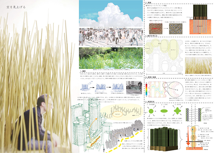 強固で固定的な建築ではなく、風にたなびくヨシ帯を人がかき分けて生まれる引き算の空間である。身体の動きに合わせて柔らかく変化する空間を想像できる。ただこの植物と設置する場所のコンテクストとの関連性、選定した植物の分析と表現はまだまだ不十分といえる。構造的な配慮から上下方向に変化する素材のつなぎ目は、節のようになるのであろうか。人工的な植物空間が、単に植物の擬態ではなく、新しい空間を獲得することを期待している。