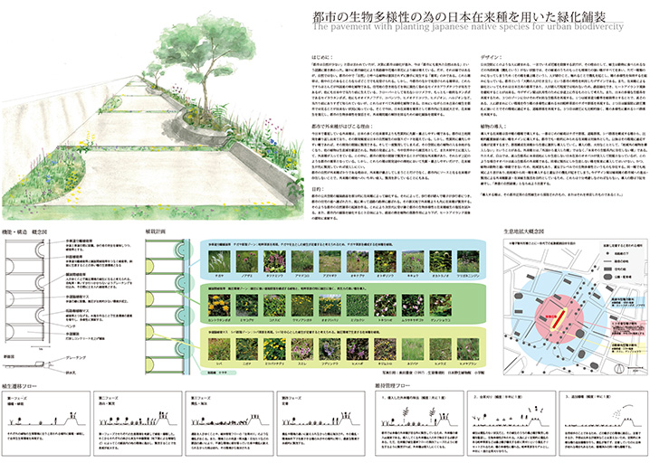 本作品は、雑草に対する価値観について考えさえられた内容である。外来帰化植物が日本固有の伝統的草花を死滅させている現状から、ただ単に保護保全するだけでなく、緑化舗装材として活用を計る斬新な提案である。歩車分離によって安全と安心を確保するとともに、ヒートアイランド現象の緩和までをも視野に入れられている。