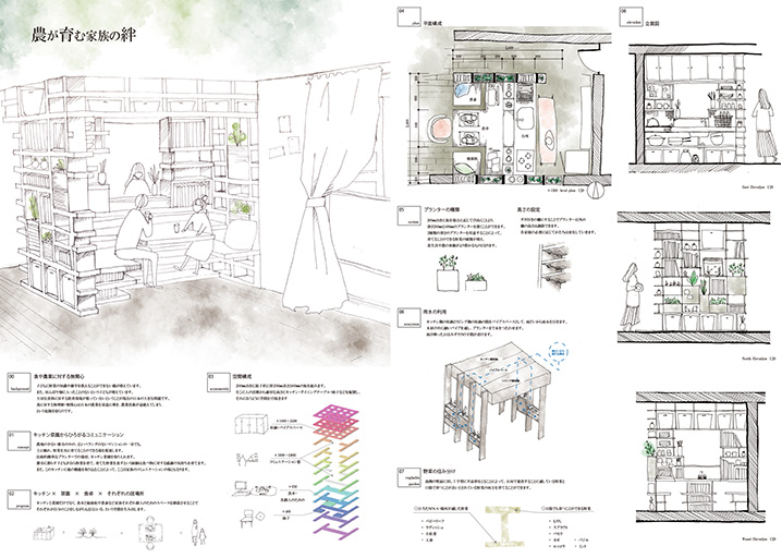 食や農業へ関心を持つことは家族にとって大変重要な事です。ご提案の“家族がキッチン空間に集い個々の時間を共有することで食と農業の大切さを体感する”…というコンセプトは「心豊かな食・住文化の創造」を掲げる弊社企業理念に高いレベルで合致しています。また暖かい手描き調タッチによるスケッチもCG画全盛の時代に大変新鮮で、高く評価しました。このようなことからクリナップ賞をお送りさせて頂きます。